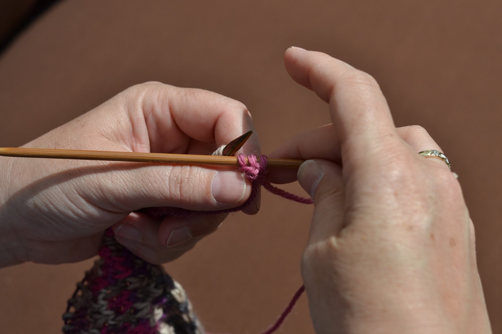- slide the stitches along the dpn and start the next row with the other dpn (step f)